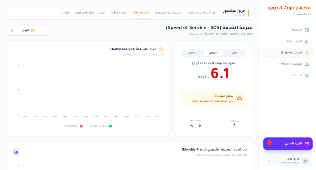 تحليل وقت تحضير الطلبات بالدقيقة وتنبيهات التأخير.