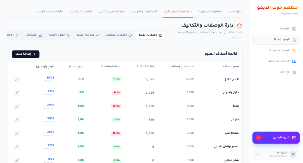 اعرف تكلفة كل وجبة بدقة. ربح الصالة وربح التوصيل ونسبة الإهلاك.